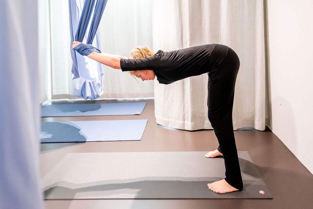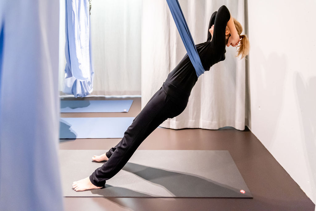 Het woord geeft het al aan: je zweeft letterlijk boven de grond omdat je in een stoffen doek hangt die aan het plafond is bevestigd. De doek ondersteunt en draagt in alle asana's, wat dieper strekken, zachte versterking en bijna gewichtloze ontspanning mogelijk maakt.