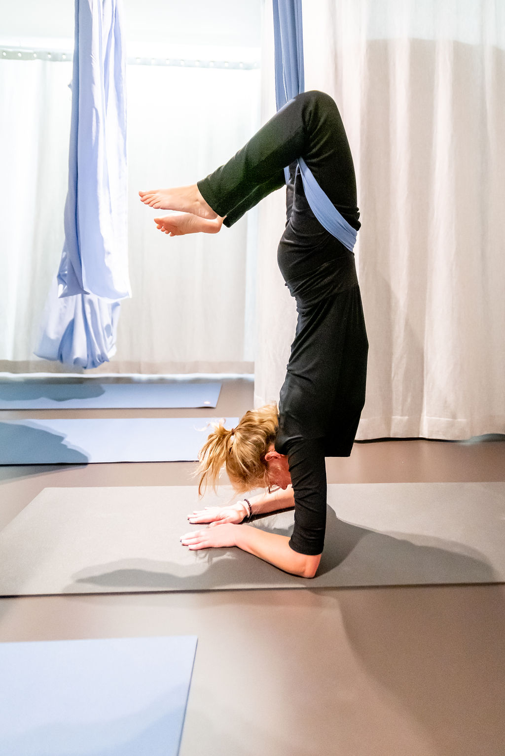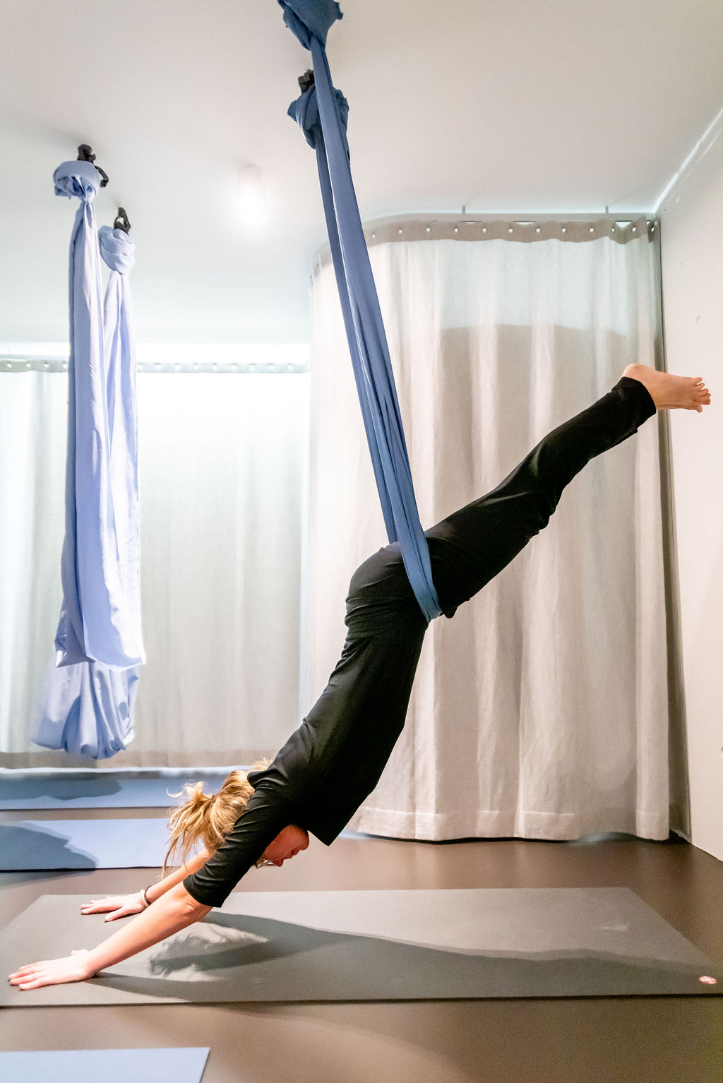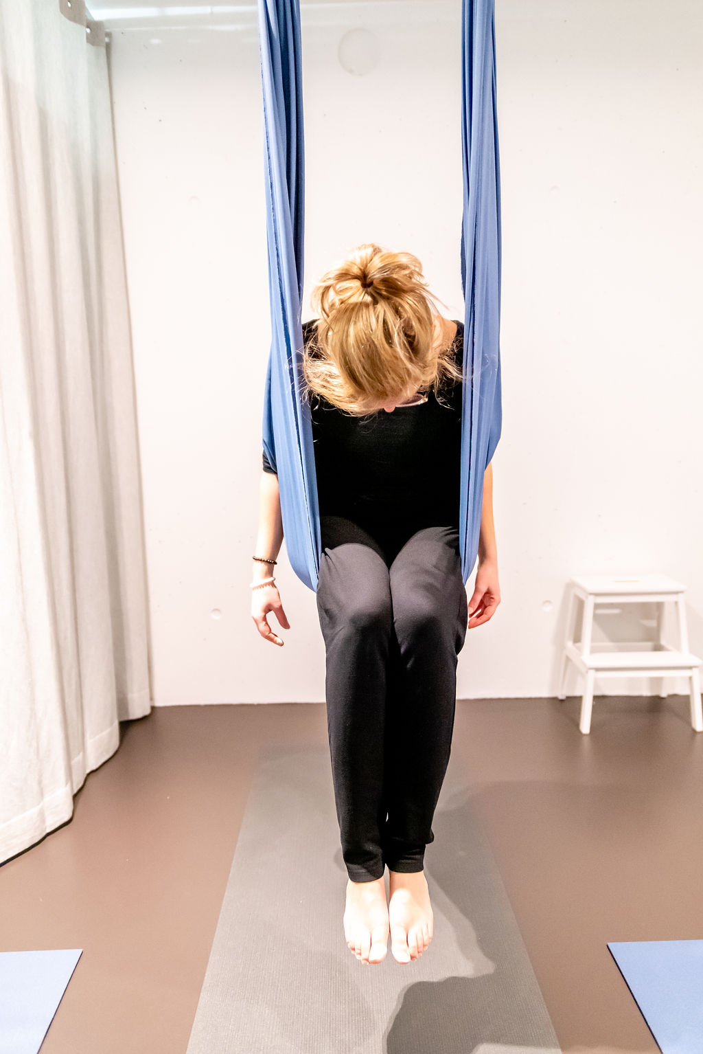 Als we over Aerial Yoga spreken, gaat het meestal over deze meer dynamische vorm van Aerial Yoga. Hierbij hangt het doek op heuphoogte. Je doet al de asana’s met ondersteuning van het doek.
